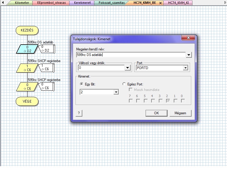 Először is döntsd el mit kacsolsz az IC-vel. +5V ot vagy testet. vagyis ha 5V-ot adsz ki a lábakon és a ledek másik fele a testen van, akkor: - ha az első gyullad ki akkor teljes fénye lesz, ha a második akkor esik a fényerő, és így tovább, ha a 8. gyullad ki akkor az összes fényereje halványabb lesz. Ez nem gond, akkor ha csak 8 leded van. Viszont a 9. led amit már másik IC hajt meg ismét teli fényerővel világít, és látható lesz a nem kicsi különbség. - Ha testet kapcsolsz akkor a led negatív lába az IC felé néz és a másik lába +5V on van. Így a fényerő egyforma lesz. Viszont ez szerint is kell besorozni az 1 és 0 kat. Vagyis ha testet kapcsolsz akkor ahova 0-t sorozol ott fog világítani a led, ahova 1-et ott nem fog. Ha +5v ot kapcsoltatsz pont fordítva lesz. ahova 1 megy ott világít, ahova 0 ott nem. ne úgy képzeld el az órajel lábat, hogy állandó frekvencia mint a chipnél. A GND és a VCC lábak tiszta sor gondolom. Ha több IC-t teszel sorba, hogy sok ledet vezérelj, akkor az első IC Q7' lábát a második IC DS lábával, a második Q7' lábát a harmadik DS lábával, és így tovább. (te csak ez első IC DS lábára adod a kimeneti értéket) Ő maga végig tolja az összes IC-n. Ha 10db IC-d van akkor 80jelet kell betolnod (1 vagy 0), hogy az összes led úgy világítson ahogy neked kell. Az összes IC-n az OE lábat összekötheted és lehúzhatod testre. Az azt szolgálja, hogy amikor testet kap, akkor megy csak ki a jel, addig nem világít semmi míg ez testre nem kerül, hiába van kisorozva. Ha folyamatosan testen van akkor ahogy kiment mind, kigyullad automatikusan. Az összes IC-n az MR lábat össze kötheted. Ezt érdemes az egyik (mindegy melyik) PIC lábhoz kötni. Ezzel tudod induláskor ki reset-elni a tartalmat. Vagyis kiadsz erre a lábra egy egyet. Vagyis PL.: D0 - 1 és D0 - 0 Ennyi. a reset. Maradt 3 láb SHCP, STCP, ÉS az első IC DS lába. Ez kell neked. Az SHCP-ket összesnél összekötöd és a PIC neked szimpatikus lábára bekötöd. PL C6 Az STCP vel ugyen ez. PL: C5 Az első IC DS lábát szintén A PIC szimpatikus lábára kötöd. PL: D2 Kisorozás: A programban fogsz egy kimenet ikont és beállítod, neki, hogy D2 és az értéke 0. Ismét fogsz egy kimenet ikont, alá teszed és C6 értéke 1 Ismét fogsz egy kimenet ikont, alá teszed és C6 értéke 0 (így kisoroztad az első led értékét 0ra. vagyis az adat lábon adtál 0-t. Majd a shift regiszterrel egyel arrébb toltad a számlálót.) Lényegében ennyi. Ezt annyiszor csinálod meg ahány ledet akarsz kigyújtani. Az elején történ választástól függően pl. ahol DS-nek 0-t adtál világít ahol 1 ott nem. Ha bement az összes led, akkor: Ismét fogsz egy kimenet ikont, alá teszed és C5 értéke 1 Ismét fogsz egy kimenet ikont, alá teszed és C5 értéke 0 ezzel az összes tároló regiszterét kitolod, rögzíted, ahogy akarod úgy hívod. Ilyenkor kellene megadni az OE lábnak a testet vagyis alacsonyra tenni, de mivel nekem már testen van ezért kigyulladnak a ledek egyből. Aztán kezdődik elölről minden. Mivel a PIC órajele 4-20 MHz ezért ezt ilyen tempóval lépteti be. Mivel neked valószínű ciklusban dolgozik a program érdemes úgy is gondolkozni. Csinálsz egy makrót amivel 1-et tolsz ki és egy makrót amivel 0-t. Aztán csak meg kell hívogatni sorba. Az *.fcm fileok makrófileok. Vagyis makró importálással tudod behívni. A KMH2 nél ne ijedj meg az elején, az egy 7szegmenses kijelző kisorozása. (0-1-2-3-4-5 H) Sebesség fokozat, ahogy a váltó áll. (H- Hátramenet, 0 üres) Mivel a ledeket mindig hátulról kell kisorozni. Vagyis a legutolsó leddel kell kezdeni, nekem az ezt vezérlő IC az utolsó. Így is nézd végig.... Ugyan így a RPM kijelzésnél... Ott láthatod a vízhőfok és a benzinszint ledjeinek a vezérlését. Mind a két makró végén látod az STCP kimenet 1 és 0 megadását. Jó bogarászást. Szerintem kezd 8db leddel. Aztán rájössz és megy akár 1000 is.