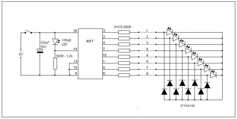 Szia! Mivel az eredeti NS-468 teszter lett lemásolva és a próbapanelon is ez lett kialakítva, én maradnék ennél a megoldásnál,mivel működik a 4017-el .A 11és 15-ös lábakat csak össze kell kötni.