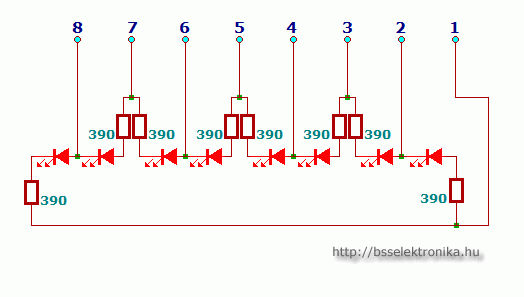 hasonló az enyém is. Igaz, ott az "adó" oldalon nincsenek LED-ek, csak a villogó LED, mint ütemadó. Véleményem szerint 1.)vagy minden (1-8) ágba tegyél antiparalell diódát, 2.)vagy az 1,2,4,7 (illetve 3,5,6,8) ágakba Jó kis szerkezet lesz!