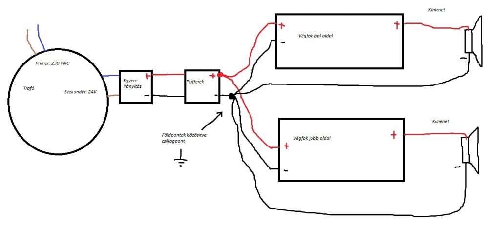 Nem igazán értem. Ha a trafón két szekunder van akkor két egyenirányító kell, kétszer pufferelsz. Az majdnem olyan megoldás mintha kétszer építenél tápegységet. Ha csak egy szekundered van akkor egy és mindkét végfok pozitív tápját a puffereid pozitívjára kötöd és az összes földpontot a puffer negatívjára. Ezzel létrehozol egy csillagpontot. A kábel miatt kétlem hogy búgna. A búgás leginkább akkor jelentkezik ha a bemenet(ek)re bejut a trafó szórása. Ezért a bemeneteket árnyékolt kábellel kell húzni. Árnyékolás ide vagy oda a bemenetre a szórás úgy is bejuthat ha túl közel van a trafód a végfokokhoz, vagy szimplán rosszul pozicionálsz. A hosszú vezetékek, kilógó alkatrészlábak mind-mind antennaként veszik vagy vehetik a trafó szórását. Érdemes toroid trafót venni/szerezni, azok szórási paraméterei a legjobbak, vagy érdemes a trafót árnyékoló kalitkába tenni. Rajzolok neked hogy érthetőbb legyen.