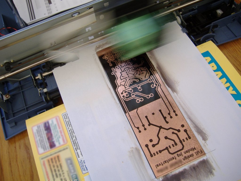 Utána jött a pofára esés. Beraktam vaskloridba, szinte rögtön leázott a tinta. Ezután a panelt lemostam (vasklorid már belekapott), hátha így jobban tapad a tinta, ismét nyomtattam rá. Így is leázott. Ismét nyomtatás, de most már intenzívebb ráégetés a hőlégfúvóval. Megint leázott.