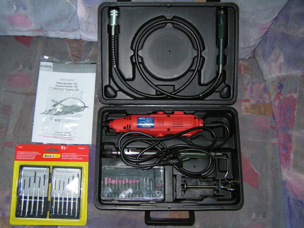 Sziasztok! Ma vettem egy extol nagy fordulatú mini gépet. Használatát megkönnyíti a tartozék flexibilis hosszabbító. Tudom ,hogy nem egy proxton ,de bátyámnak 4 éve ilyen van ,használtam is az övét már előtte ,így nem volt zsákbamacska. A csavarhúzókészletet is ma vettem ,nem egy profi készlet ,de egy korsó sör áráért nem hagytam ott (gondolom van aki szerint inkább egy sört kellett volna innom )Bővebben: Link Bővebben: Link