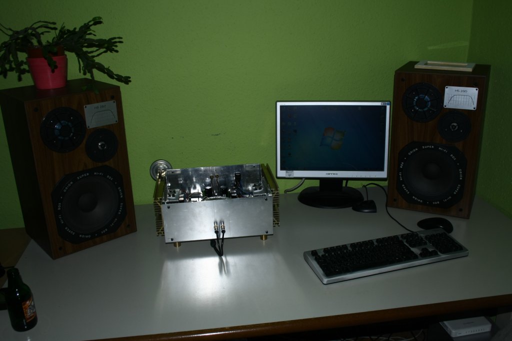 Sikerült a mai napomba berakni ezt a fényképezést. A cuccot behoztam, mivel kint csak a psp-men mehetett a tesztelés ami nagyon halkacska volt. Először kicsit fel is háborodtam, hogy a feszültség növelésével sem sikerült hangosabbá varázsolni az erősítőt. De rájöttem, hogy a jel amit kiad magából az nem nagyon elég ezért behoztam a géphez és ezen teszteltem...