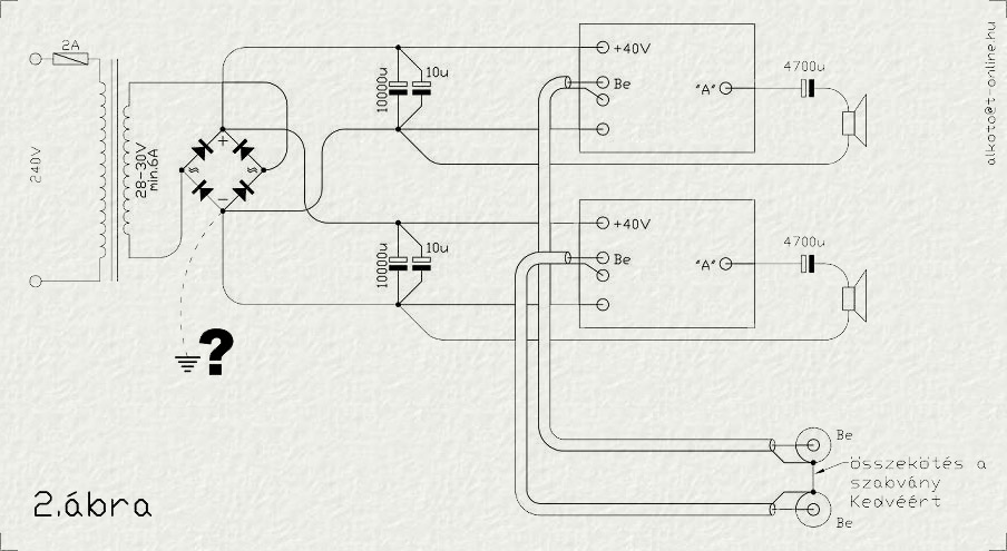 Ma sikerült összehozni a másik csatornát is. Szereztem egy 300VA-s trafót 24 voltosat. Amikor bekötöttem akkor búgni kezdett. Az okot nem tudom . Eddig csak az egyik felével szórakoztam, igaz más trafóm volt, de akkor is. Eddig 115VA val és 24 voltal próbálkoztam, most pedig csupán a max terhelhetőség nőtt. A mellékelt kép alapján kötöttem be. Annyi az eltérés, hogy nekem 2 egyenirányító hidam van. Attól lehet esetleg, hogy túl vékony a táp kábel? Ami a konnektorból a trafóba megy. (én erre gyanakszok) Ha jelet adok neki akkor szól meg minden csak a háttérben ott az a fránya búgás. Ja és még valami: A trafó is elég hangos, lehet hogy túl öreg?! Az is ilyen recsegő hangot ad ki. No nem mintha az előző nem adott volna ki ilyen hangot, de ez még hangosabb.