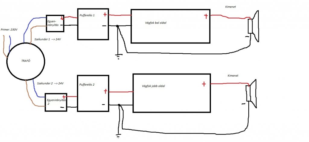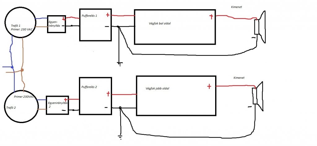 Nem igazán értem. Ha a trafón két szekunder van akkor két egyenirányító kell, kétszer pufferelsz. Az majdnem olyan megoldás mintha kétszer építenél tápegységet. Ha csak egy szekundered van akkor egy és mindkét végfok pozitív tápját a puffereid pozitívjára kötöd és az összes földpontot a puffer negatívjára. Ezzel létrehozol egy csillagpontot. A kábel miatt kétlem hogy búgna. A búgás leginkább akkor jelentkezik ha a bemenet(ek)re bejut a trafó szórása. Ezért a bemeneteket árnyékolt kábellel kell húzni. Árnyékolás ide vagy oda a bemenetre a szórás úgy is bejuthat ha túl közel van a trafód a végfokokhoz, vagy szimplán rosszul pozicionálsz. A hosszú vezetékek, kilógó alkatrészlábak mind-mind antennaként veszik vagy vehetik a trafó szórását. Érdemes toroid trafót venni/szerezni, azok szórási paraméterei a legjobbak, vagy érdemes a trafót árnyékoló kalitkába tenni. Rajzolok neked hogy érthetőbb legyen.