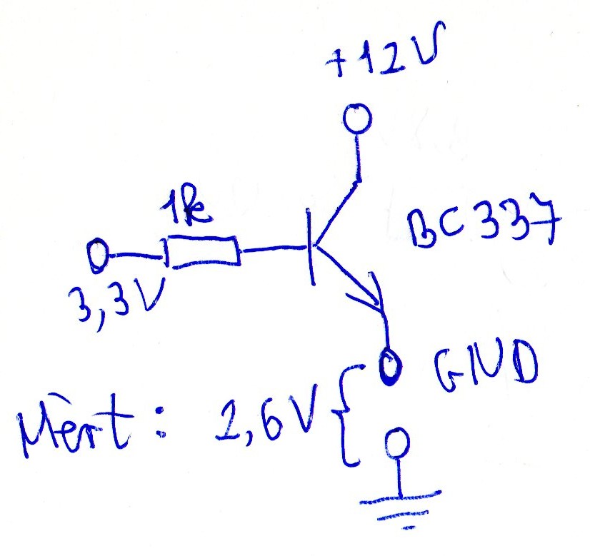 Adott a mellékelt képen lévő áramkör. A problémám az, hogy csak 2,6V-ot mérek a jelölt helyen. Bázisellenállás nélkül is. Próbából BD433-ra cseréltem a tranzisztort, annyi a különbség, hogy 2,8V-ot mértem. Miért nem 12V van a jelzett helyen? És mit csináljak vele, hogy annyi legyen? Egy LED szalagot szeretnék vezérelni, egyelőre a nélkül próbálkozok, méricskélek. A vezérlő áramkör 3,3V-ról megy, azt nem tudom megemelni. De most a próbák miatt, direktbe 3,3V-ra van kötve a tranzisztor. Előre is köszönöm a válaszokat! |