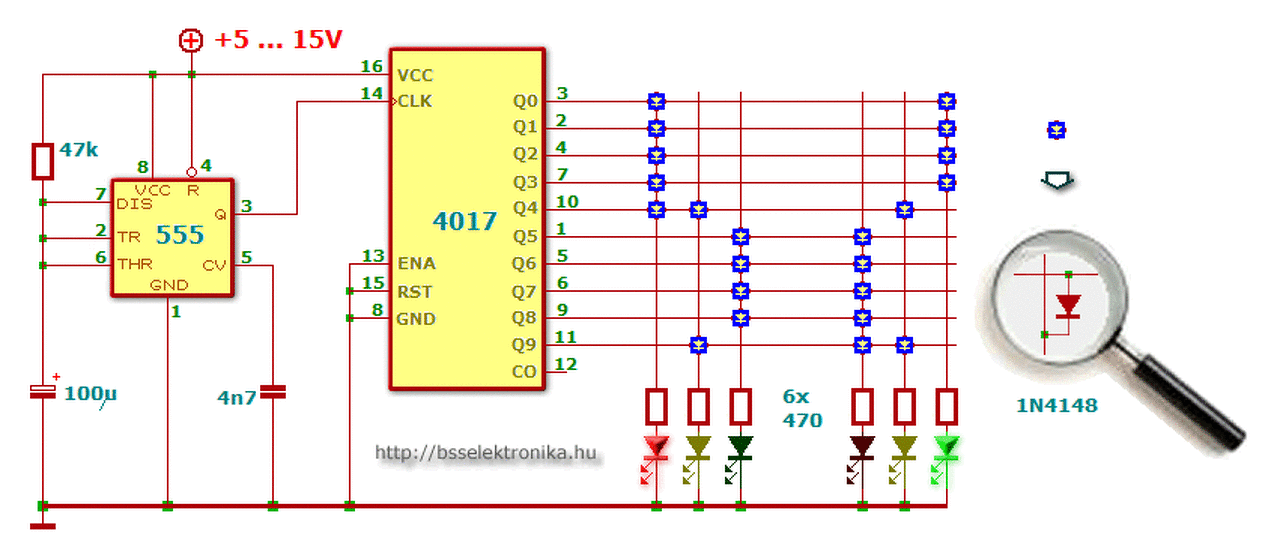 Szia! Én bizony akárhogy méregetem,nézegetem,minden pontosan ugyanúgy van, ahogyan a kapcsolási rajzon. Ahogy mind a 7 kimeneten, a 4-es lábon is megjelenik a 10.9 V, eljut az U1b 6-os lábához. Az R7 en keresztülmenve már csak 3.6 V a feszültség. Az U1b 4-es, és 5-s lábán is mindig 10.9 V van. Nemtörténik semmi...