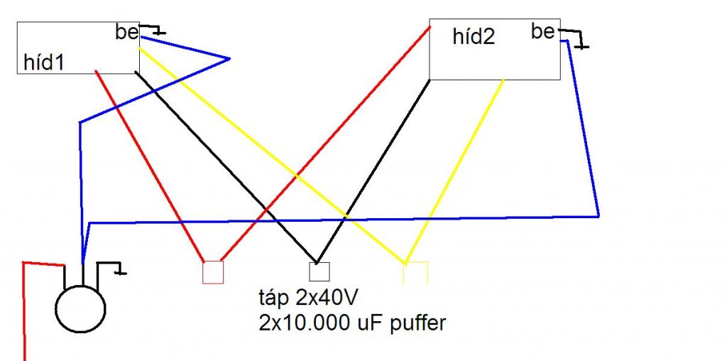 Edig a táp úgy volt hogy a kondikról mentek egy-egy drótok a végekhez. Egyik ismerősöm javasolta hogy a testet vegyem le a kondiról és : a kondiról test az egyik végre és onnan tovább a test a másik hídra. Így jelentősebben halkabb lett a zúgás. Mit tehetek még? Amíg csak egy híd volt nem volt búgás. Ha az egyikről lekötöm ajelet az nem búg de a másik ugyan úgy. Ha a második véget lekötöm a jel tetstet is akkor éppen hogy csak zúg az első. Az már elfogadható.