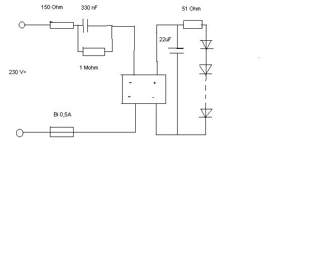 A kapcsolás rém egyszerű! 150 Ohm 0,9W - 330nF630V - graetz 250V1A (smd) - biztosíték 0.5A Egyenáramú oldal 22uF63V- 51 Ohm 18x fehér LED sorban. (A 330nF párhuzamosan 1Mohm hogy ne rázzon ha kiveszed) Lehet utánépíteni javítani, Mi van ezen 3 000 HUF?