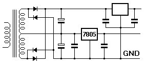 Köszi a választ! Én is középről akartam kivezetni a feszültséget. Csatolom a rajzot (bocsi, csak paint volt kéznél). Azért maradtam a régi 7805-nél, mert a túlvégen PIC figyelt volna, és ezek talán kevesebb zavart raknak a tápra, másrészt volt otthon, amíg ki nem lehelte a füstjét.