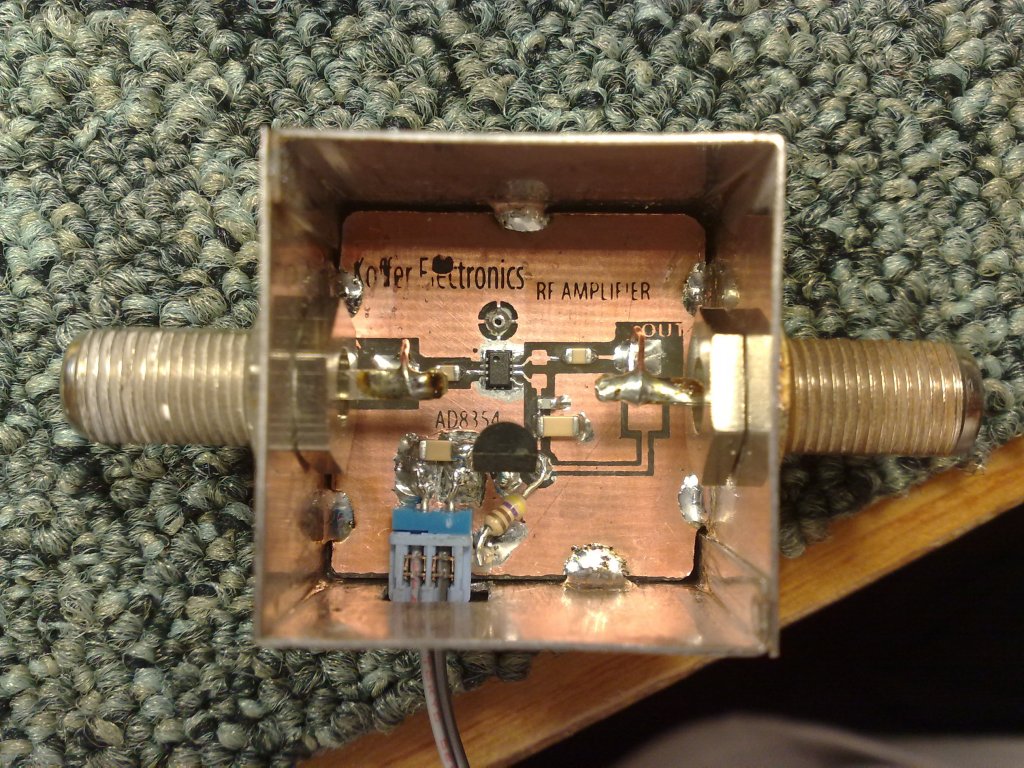 Megépítettem életem sokadik, de első működő antennaerősítőjét. Ez egy AD8354 IC-re épül (igazából ez maga az erősítő). A beforrasztás többszöri nekifutásra ment csak, végül forrasztópasztával és forrólevegővel sikerült, amit utána vékony pákával megigazítottam.. A tápfeszt egy 78L05 adja neki. A rajzolat az adatlapjában megadott volt, erre raktam rá utólagos ötlettől vezérelve a csatlakozót és a 78L05-öt, mert először távtáplálásban gondolkodtam. Ráadásul ez az első dry filmes panelem, gondolom látjátok, hogy még finomítani kell a technológián. A doboz valaha egy szűrőnek adott otthont, de mivel az felesleges volt, ezért meg is örültem, amikor eszembe jutott, hogy van nekem ilyen is. Van még egy ilyen IC-m, úgyhogy majd lehet, hogy egyszer csinálok neki egy testvért is, de már igényesebb kivitelben. Jan