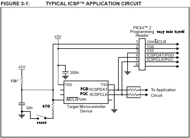 - Az MCLR lábat, 10kohm-mal fel kell húzni a Vdd tápfeszültségre.