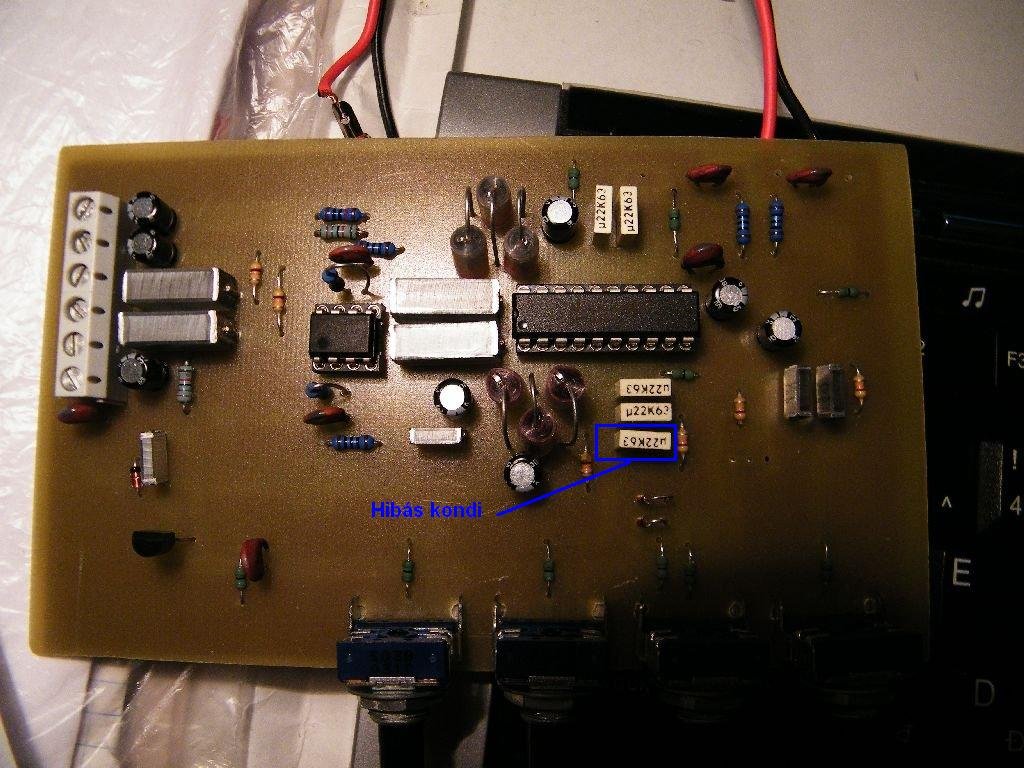 Köszönöm a segítséget, valóban igazad volt a C12 -es 10nf-os kondi helyére egy 1 nF kondi került. A jelölését elnéztem , 103 J helyett 102 J - ( zöld színű az IC 1 és lába alatt látható) -volt bele téve, méretben szinte ugyan az. Kicseréltem tökéletesen működik.