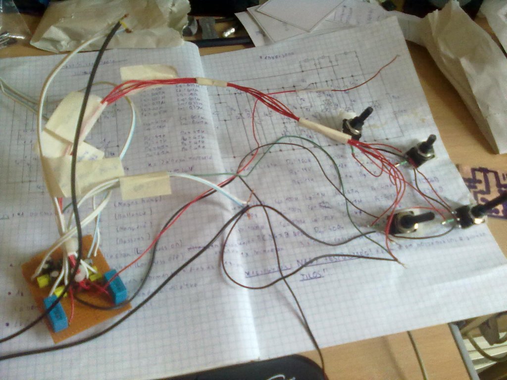 Vezetékek össze visszaDe egyébként, az számít, hogy az ellenállásokat közvetlenül a potikra forrasztottam, és onnan vezetékeztem be az áramkörbe? 10 perc, és lesz kép is remélhetőleg.