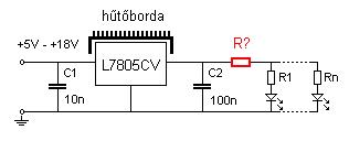 Csináltam egy kis rajzot a válaszod alapján. Tehát ha jól értelek párhuzamos kötés esetén addig terhelhetem a tápom amíg el nem érem a megadott mA teljesítményét , az én esetemben ez 500mA . Pl.: 500mA / 20mA = 25 db LED A feszűltség álandó a 7805 stabIC miatt +5V. Az előtét ellenállások pedig : 5V - 3.3V / 0.02A = 85 Ohm 0.25W VAGY 1 db 3.9 Ohm 1W ellenállást használok a rajzon pirossal jelölve, de akkor a LED-ek elé nem teszek előtét ellenállást. Szerinted jó e a kapcsolás, és melyik verziót javasolod ?