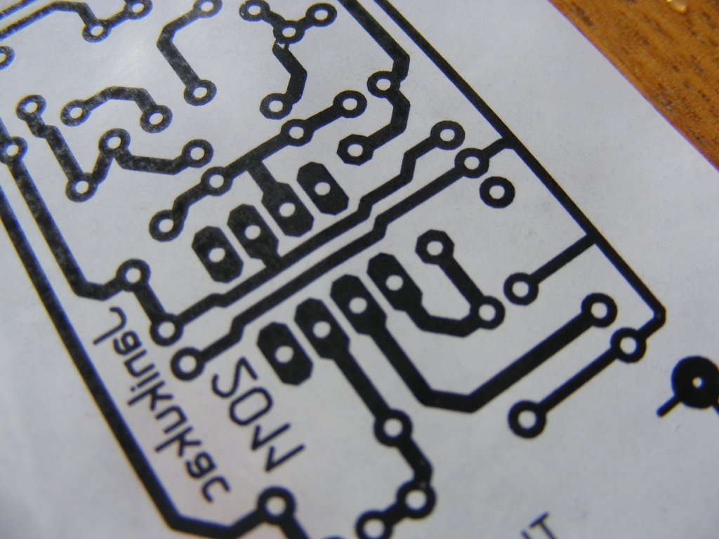 Olyan a vasalóm, mint Attila86-nak a vasalós videojában. Kinyomtatom a Konika Minolta 1350W nyomtatómmal a rajzot újságra, ami fel van még ragasztva egy sima a4-es lapra. Azt ráhelyezem a 800-as papírral felprolírozott, alkohollal zsírtalanított panelra, és rárakom a vasalot, néha enyhén mozgatom. 7 s után zsepivel törölgetem, és ezt sokáig ismételgetem, aztán leáztatom, és vége.