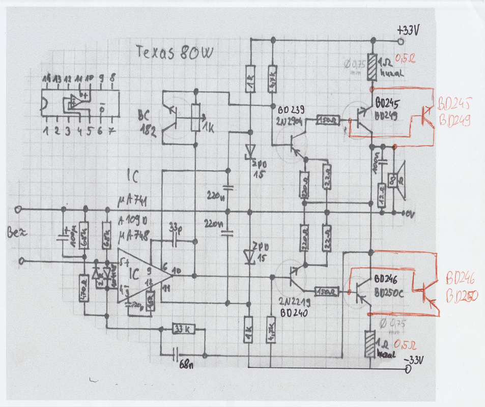 Aki megnézte az általam készített TEXAS végfokot az láthatja, hogy a vége 2SA..-2SC.., a meghajtó pedig BD237-238. Egy jó tanács azoknak akik meg szeretnék építeni. A BD-s tranyókat felejtsétek el. Én ezzel a végfokkal 2szer megsz...tam. A jelenleg kapható BD-s tranyók nagy része KÍNAI akármi. Mivel én Toshiba végtranyókat használok javaslom hogy a meghajtók is legyenek Toshibák. Én már kicseréltem őket. BD237 -> 2SC3421, BD238 -> 2SA1358,......BC182 -> 2SC2235. Sok sikert a megépítéshez. Az enyém jelenleg 2X33V-ról megy hídba kötve.