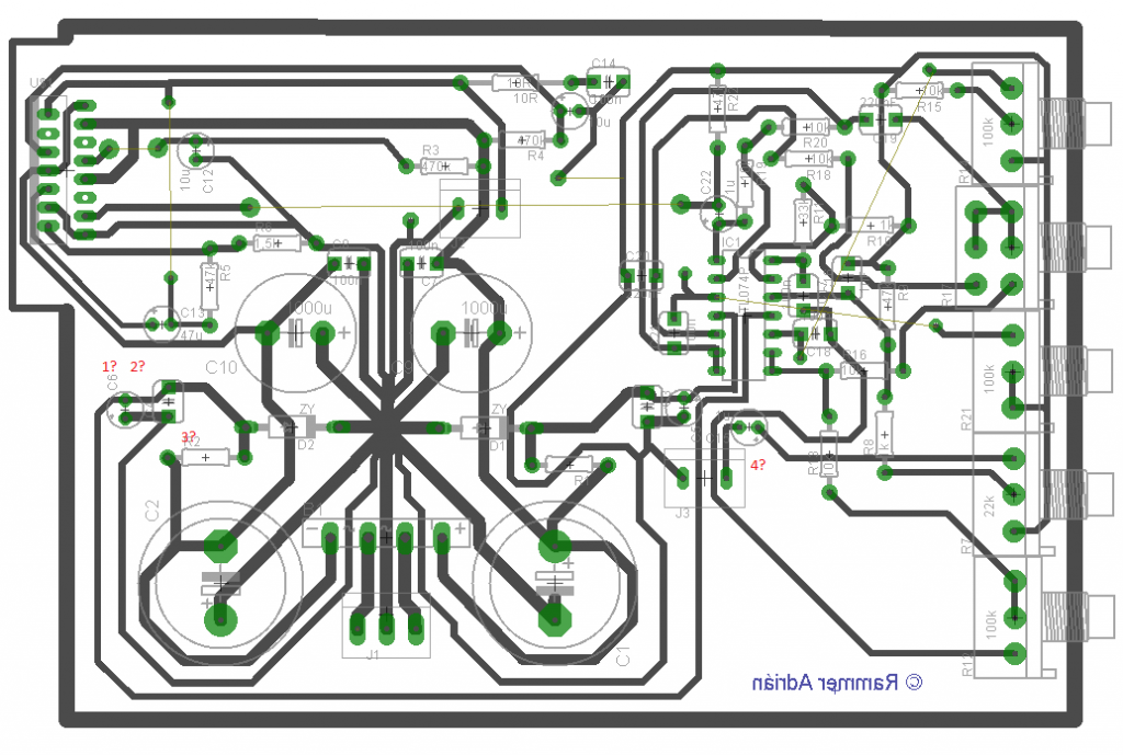 Látom, hogy a negatív tápágban az egyik kerámia kondi (talán a C4) hiányzik a paneledről. Bár a hiba nem hiszem, hogy ettől lenne.