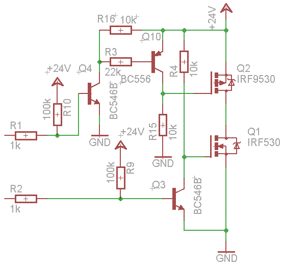 Ha bármit nem értesz, akkor kérdezz. A kapcsolás nagy előnye az egyébként hogy galvanikusan le van választva a vezérlés és a nagy áramú táp. Ha kell csatolom a másik verziójú H-hidat is, amelyben N és P csatornás MOSFET-ek vannak. (De még az sincs szép formába rendezve.)
