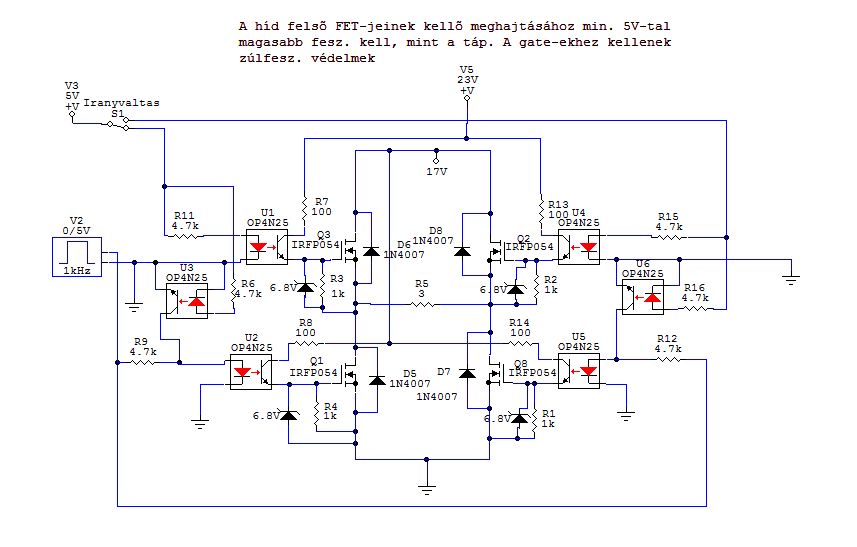 Szia, íme csatolok egy olyan kapcsolást, amit nemrég rajzoltam (még elég trehány szegény), és még nincs szépen elrendezve, ill. gyorsabb optók kellenek és nagyobb feszültségű zéner diódák, ha 100ohm-os meghajtó ellenállások vannak. De a gyors kapcsoláshoz ajánlott minél kisebb érték. Mivel a FET-eknek van gate-source kapacitásuk, amit fel kell tölteni. (Minél gyorsabban feltöltöd, annál gyorsabb tud teljesen kinyitni és annál jobb hatásfokú lesz a H-híd.) A tápzárlatot azzal kerüli el ez a kapcsolás, hogy egyforma optocsatolók vannak, és a FET-ek bekapcsolási ideje megegyezik az optók adatlapjában megadott bekapcsolás+kikapcsolási idejével +tau=RC, (R-->ellenállás, C-->gate-source kapacitás). Míg a kikapcsolási idő csak a kikapcsolási idővel egyezik meg (+tau). Így ha minden optó egyforma típus, akkor garantáltan elkerüli az egybenyitást. A 4N25 viszont elég lassú ide. (De a szimulátorban csak ez volt, emiatt van benne ez.) Azzal csak max. 500Hz-cel érdemes rángatni, mert különben rossz lesz a hatásfok.