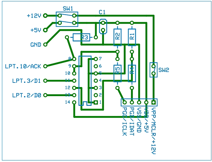 Vettem a bátorságot, hogy a kapcsolások közt szereplő Egyszerű LPT égetőáramkör 2-höz NYÁK-ot rajzoljak. Nem akart kijönni a kapcsolás szerinti IC lábkiosztással, így "fejre állítottam". Nem tudom, hogy szükséges-e, de a többi nem használt kapu 1-3-5 lábait GND-re kötöttem, mint az eredeti kapcsolásban 9-11-13-at. Zölddel írtam a kapcsolásba, hogy melyik lábakon változtattam. Az ellenőrzést előre is köszönöm. (Egy régebbi PC-be építeném be, a tápról szeretném venni a 12V, 5V-ot. Egy HDD-tartó keretre kerülne a nyák, egy előlapra vezetném ki az ICSP-t és a 2 kapcsolót.) A rajz ExpressPCB-vel készült.