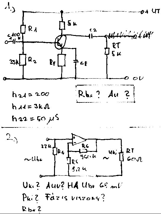 Ami fel van irva a fűzetben. Az elsőnél a kérdés : Rbe=? Au=? A Másodiknál a kérdés:Rbe=? Auv=? Fázis viszony=? Vki=? Pki=?..............Ha Vbe=68mV