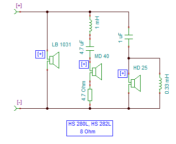A HS288 egy eléggé sokszínű széria volt... Találkoztam olyanokkal, amikben a 280-as váltója volt, de láttam olyanokat is, amelyikben a HS282-ből jól ismert légszerelt "váltó" volt. Ha ezt akarod megépíteni, akkor a magas elé 1-1,5µF nál nagyobb kondit ne tegyél 8 Ohm esetén, 4 Ohm-os esetén 2,2uF. Ha nagyobbat teszel be, a hangzásnak sok jót nem tesz, maximum annyit, hogy már 10-15W teljesítménynél is egyszer csak elhallgat a magas...