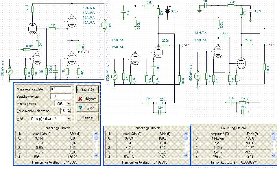 Igazi minőségét meghallgatva tudod eldönteni. TINA segít méretezni (idealizált viszonyok között szimulál), kapcsolás működőképességét el lehet vele dönteni, nem kell összeállítani az áramkört a valóságban. Végén valós mérésre és meghallgatásra is szükség lesz. Ezeket a kapcsolásokat hibridhez én nem használnám. Hibrid végén lévő félvezetős buffer viszont nem, invertáló lesz a cucc. Kimenete nem lesz fázishelyes.