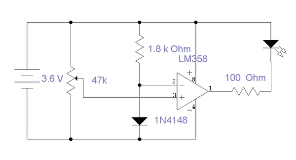 Annyit hozzáfűznék a kapcsolási rajzhoz, hogy az LM358 adatlap szerinti minimális tápja 3V. Szab. tápról próbálva 2,6V -ról még működött, de lehet, hogy ez példányonként változik. Talán érdemes lenne alacsonyabb feszültségről is működő műveleti erősítővel lecserélni. A 47K trimmer értéke sem kritikus, csak a billenési küszöböt állítod vele.
