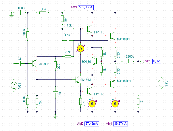 A táp természetesen rövidzárvédett és áramhatárolt nálam, max. 2A. Tulajdonképpen a két végfok alsó tranyóit kell - szerintem - párba válogatni egymáshoz.