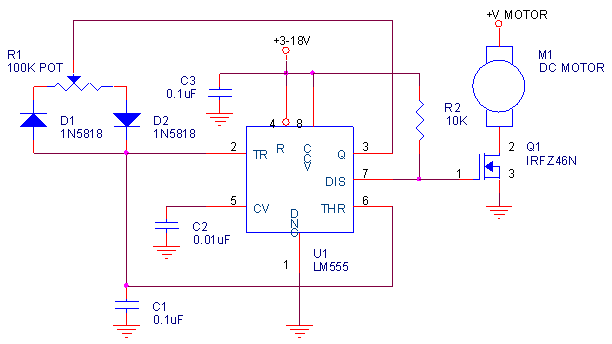 Szoval ez a kapcsolas alkalmatlan a FET meghajtasara. A FET nyitott kollektoros meghajtasa nem nagyon jo, mert kepzelj el a 555 7. laban egy 4-5 nF kondenzatort. Ennyi a FET G kapacitasa. A lassu be-ki kapcsolas alatt megno a FET disszipacioja, es valoszinu tonkre is megy. Talan a "DC motor PWM szabalyzasa" topikban kellene szetnezni egy jobb kapcsolas utan. Esetleg ebben a G-t a 3. labra kotni, mar is lehet hogy javulna a FET meghajtasa.