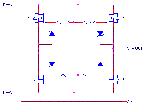 A bemenő feszültség szinuszos. Azt mondod ez így nem működik? Egyébként a rajz forrása az, amit kadarist linkelt. Van még egy bonyolultabb megoldás is, de ez számomra már eléggé összetett, és a bejövő fesz. elérheti az 50V-ot is, nem tudom mit kéne rajta átalakítani. Gondolom az összes ellenállás értékét meg kéne növelni, de akkor meg alacsonyabb fesz. esetén lehet gond. Igazából csak azt kéne megakadályozni, hogy a Mosfet GS feszültsége a maximális 20V fölé menjen. Ha jól gondolom az az 50V a két mosfeten megoszlik, így elméletileg maximum 25V jutna mindegyikre. A mosfetek GS ellenállása meg ha jól tudom GigaOhm nagyságrendű, így a soros ellenállás is problémás.