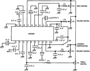 Az LM1036-ban nincs előerősítő. Jelet csak a hangszín kiemelés növel. Az utóbbi linked elvén működő keverés minden szempontból előnyösebb. Annál 470k/100k-szoros erősítés van.