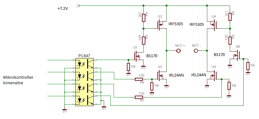 Igazából csak most néztem meg alaposabban amit az előző oldalon küldtél, köszi. Mikrokontrollerem van ami majd kiadja a PWM jeleket és minden egyebet amit kell, nekem csak a H-híd részére van szükségem, csatolom ide még egyszer a pdfet, ha esetleg találna benne valaki valamilyen hibát. Tehát megépíteni csak a H-híd részét fogom, a tápegysége 7.2Vos akkumulátor lesz és a mikrokontrollertől fogja kapni az 5Vos logikai jeleket amit majd leválasztok egy opt csatolóval is.