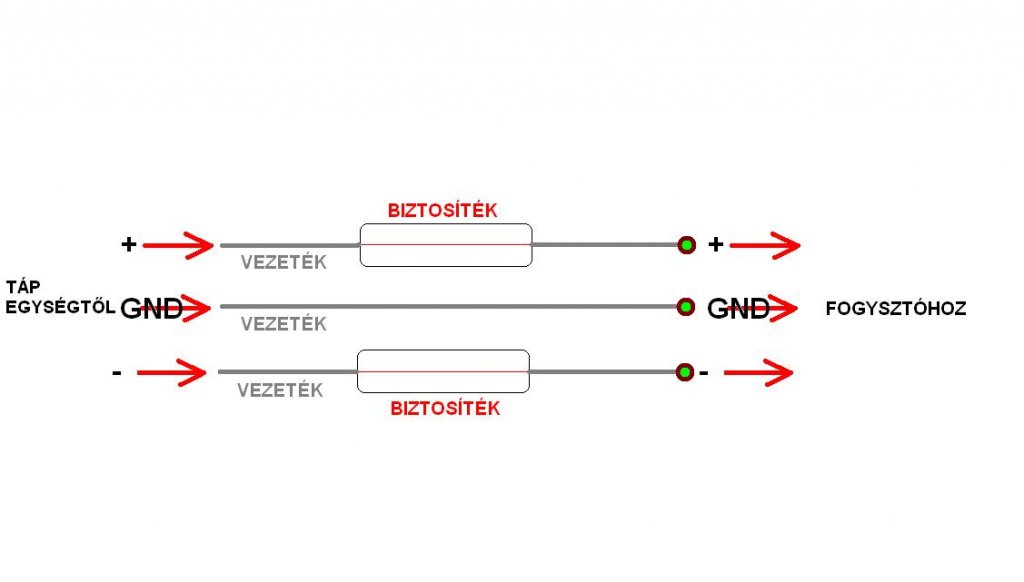 Nem,csak a + és - ágba kell biztosíték,a gnd-hez nemkell.(kicsit rosszul rajzoltam oda)