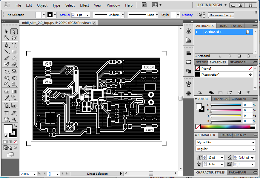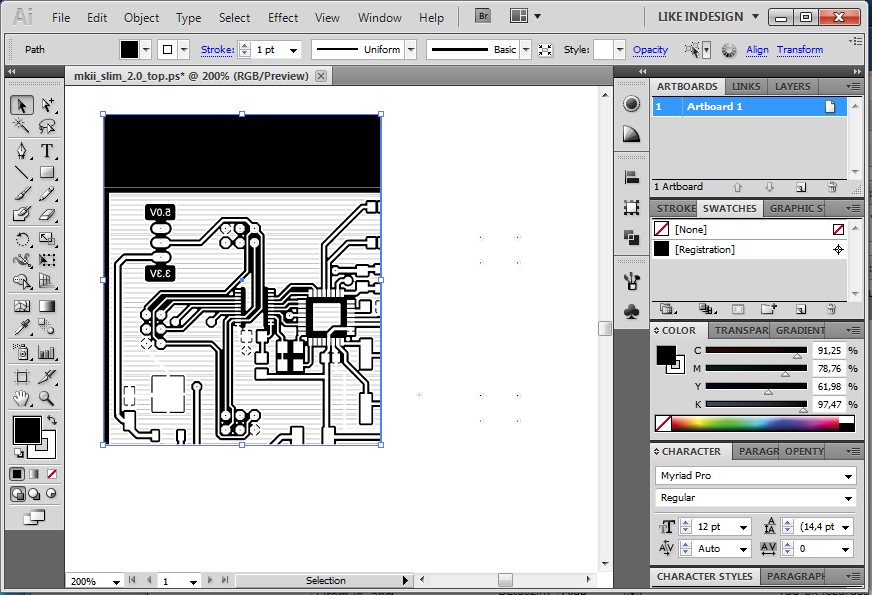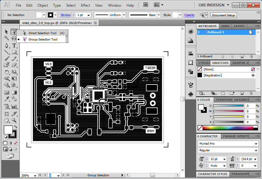 Megpróbálom érthetően összefoglalni, de előre szólok, hogy az Illustrator használata nem a szakterületem. Azt írom le, ahogy én csinálom. Tehát elképzelhető, hogy megy egyszerűbben is. (Talán egy grafikust kéne megkérdezni.) Egy példán keresztül mutatom be, képekkel illusztrálva. Ez egy nem túl régen készített kétoldalas nyák TOP oldala, tehát tükrözve PS vagy PDF-be (ez mindegy, amelyik a szimpatikusabb) nyomtatjuk az Eagel-ből. 1. Megnyitjuk a fájlt -> kép1 2. Kiválasztjuk a "Group Selections Tool"-t -> kép2 3. Kijelöljük azt a területet, amit invertálni szeretnénk -> kép3 4. A felső menüsorból EDIT -> EDIT COLORS -> INVERT COLORS. Ezután invertálva, de még kijelölve megjelenik az ábra. Majd kattints valami üres területre, hogy megszüntesse a kijelölést. Ezt kell kapnod -> kép4. 5. Kiválasztod a "Rectangle Tool"-t -> kép5 folyt. köv.