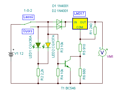 Az lm317 szakitani akarom a feszöltségét hogy ha nem kell a ventilátor akkor ne menjen. Ugy lenne megcsinálva hogy gyors ki lassu a gyorsnál a zöld led világit ki állásnál egyik se a lassun meg a sárga led világitana. De ha igy csinálom akkor egyik se támadja a másikat hátba. Itt számolni kel a dióda nyitó feszültségével.