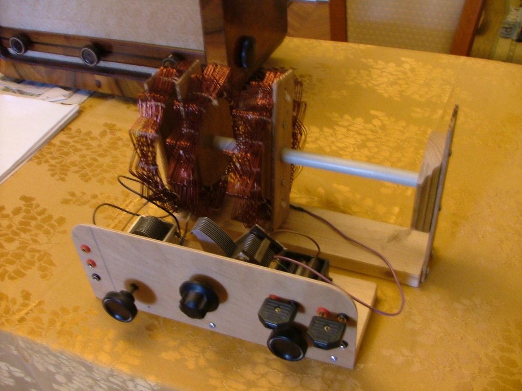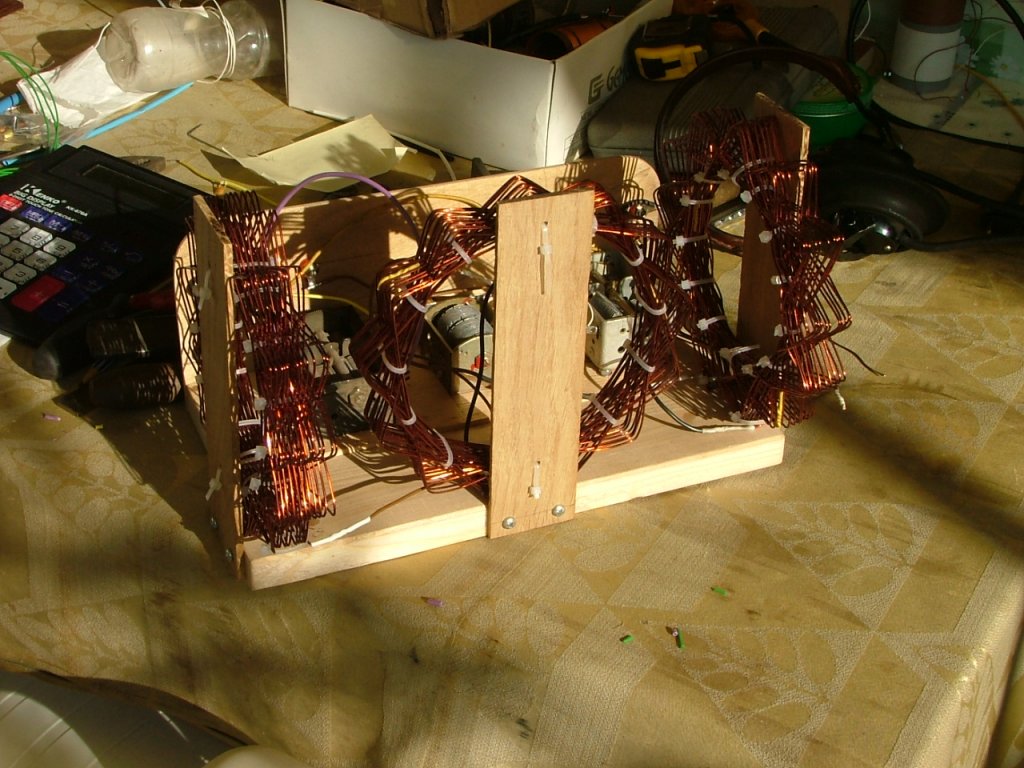 Az igazság az, hogy ez a készülék ebben a formában csak egy kísérlet, hogy egyáltalán működik e. Készülni fog ennek egy kidolgozottabb formája.Lehetséges és szinte biztos, hogy egy ferrit magos kosártekercsekből álló módozatát is megcsinálom, mert ezeket a nagy tekercseket nehéz lenne dobozolni és kár is lenne eldugni őket.Viszont még az összeépítésen javítani kell és érdemes is. Bevallom, hogy elkövettem egy eretnekséget is:a fűhallgató helyére egy a TV.-hez használt infra fejhallgatót kapcsoltam.Az adaptere ebben az esetben erősítőként is működött. Így már olyan nagy hangerőt is elő lehetett állítani, ami már túl erős volt.De ez már nem szabályos, viszont roppant célra vezető. További jó munkát kívánok.