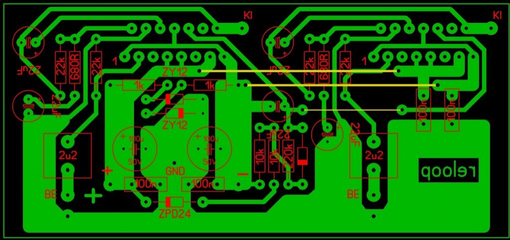 Ez továbbra is a Reloop elképzelése szerinti egytápos-híd kapcsolás, sőt a panelterv alapja is az övé. Ez utóbbin azért kellett igazítani, mert nem akartam túlzottan hosszú átkötéseket, illetve ettől fontosabb az eltérő rögzítési mód lehetőségének megteremtése. Az erősítő IC-k felfogatása nem a saját csavarjukkal történik (de akár azzal is lehet), hanem egy külső szorító lemezzel/kengyellel. Több ilyen megoldást láttam gyári készülékekben, és nálam is nagyon jól bevált. Annyi szépséghibája van a tervnek, hogy csak jelentős méretnövekedés árán tudtam volna megoldani a rögzítő csavarok előtti hely szabadon hagyását, ezért erről lemondtam. Hatlapfejű M4 vagy M5 méretű csavarokkal, villáskulcsot használva, jól hozzáférhetőek a csavarfejek, ezt a megoldást javaslom másoknak is. A terven sárgás színű vonalakkal jelöltem azokat a sávokat, amiket célszerű lehet ónozással megerősíteni. E nélkül is 6A fölötti áramok folyhatnak 35um rézréteg-vastagság esetén, de az ördög nem alszik. A NYÁK-rajzolat az alaktrészoldal felőli nézetben látható, tehát pl. vasaláshoz alkalmas. Ennek nyomtatásakor oda kell figyelni, a "lapmérethez igazít" opció kikapcsolására, mert ellenkező esetben kisebb képet kapunk mint kellene. A méretet is ráírtam, azt is le lehet ellenőrizni.