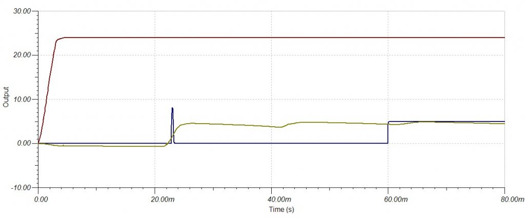A mellékelt ábrákon a kimenet 5V, a terhelés 100mA, DC-OFF kikapcsolva 60ms-nál, a piros és sárga a két Zeneres táp a műveleti erősítőknek, a kék a kimenő feszültség. Az első verzió a T6 nélküli, az gyakorlatilag bármilyen áramkörre halálos lehet.