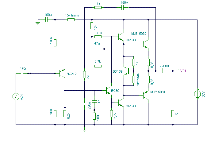A következő és végleges változathoz az első tranyó 2N5087 ugyan filléres, de kimondottan kis zajú, nagy erősítésű. A végén vagy békebeli BDY73, vagy annál is jobb fogja szürcsölni az áramot. Megérdemli ez a cucc azt a kicsivel több pénzt minden tagjában. Idézet: „Szerintem ne emeld fel a nyugalmi áramot 1.8.Csak addig emeld amíg szükség van rá.” Ennel a kapcsolasnal a szukseges kiveheto legnagyobb teljesitmeny es a terheloimpedancia nevleges erteke alapjan celszeru beallitani a szukseges tapfeszultseget es nyugalmi aramot. Ezt mar az eredeti, 1969-es cikkben is leirta a szerzo. Magyarul ha meghatarozzuk, hogy adott teljesitmenyt szeretnenk kivenni az erositobol akkor kisebb erteku terhelo impedanciara kisebb tapfeszultseg es nagyobb nyugalmi aram szukseges, magas erteku terheloimpedanciahoz magasabb tapfeszultsegre es kisebb nyugalmi aram beallitasara van szukseg. De ettol termeszetesen el is lehetterni csak tudni kell mit miert csinal az ember. A lenyeg, hogy erdemes megtervezni/megtalalni mindenkinek azt a beallitast ami a rendszerehez a legjobban illik.
