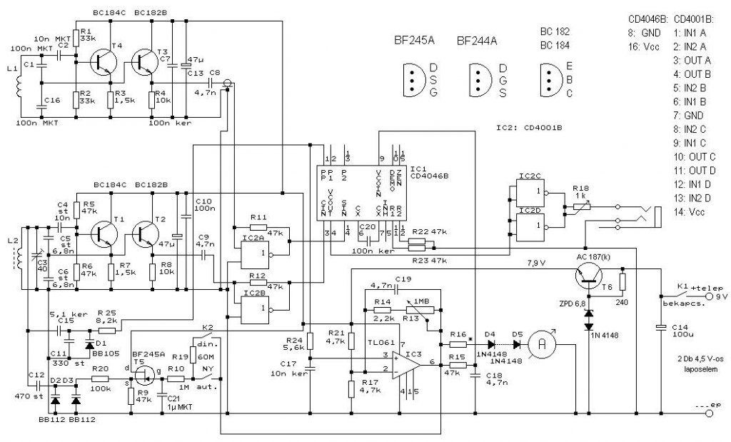Viszont egy frekimérővel életre lehet kelteni, nem kell hozzá szkóp. Érmézéshez kiváló, a keresési mélysége hagy egy kis kívánnivalót, de volt már hogy sörösdobozt nedves homokban 2 ásónyi mélységről jelezte. Az alumínium fület 15 cm mélyről jelzi. Az áramkörön annyit módosítottam hogy egy egyszerű stabilizátort építettem a telepek után, (2x4.5 V laposelem) és 8 V - ra állítottam be. Ez elég sokat használt az oszcillátorok együttfutása szempontjából. A másik változtatás a helyi oszcillátort a keresőoszcillátor szerinti kapcsolás mintájára építettem.