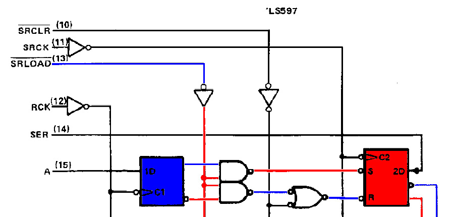 Idézet: „Amit meg szeretem volna tudni, hogy ha a shift regiszterében 1es van és a latchben 0 akkor a latch a PL aktiválásával felülírja e azt vagy sem?” Persze hogy felülírja, hiszen így kell működnie. Csak hogy szemléletes legyen; kiszíneztem a kapcsrajz idevonatkozó részét a beírás pillanatának állapota szerint. (piros=1, kék=0) Tehát: A latch FF 0 értéket tárol, azaz Q=0, /Q=1. Mivel a SR beíró jel (/SRLOAD, másnéven /PL) aktív - azaz alacsony - a két NAND kapú kimenetén Q és /Q negáltja jelenik meg. A negált bemenetű NOR kapú egyik bemenete 0, tehát a kimenete a másik bemenetől függetlenül szintén 0 lesz. Az SR FF /S bemenete így 1 (nem aktív), a /R bemenete viszont 0 (aktív). Emiatt az SR FF tartalma törlődik (bármi is volt előzőleg az állapota), tehát Q=0 és /Q=1 lesz. A soros kimenet (Qh) az utolsó FF /Q kimenetének negáltja lesz. A működés tehát teljes mértékben az elvártak szerint alakul. Mégegyszer: ne zavarjanak össze a negált bemenetek és kimenetek!
