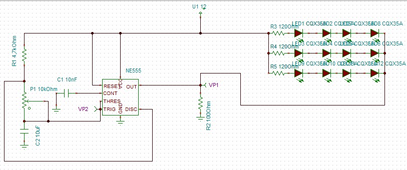 Olvasgattam régebbi hozzászólásokat, de nem válaszoltak a kérdéseimre. Adott lenne az alábbi 555 alapú astabil kapcsolásom, aminek csak az egyik kimenetére tennék ledeket. Számszerint 11 darabot, együtt kellene villogniuk. Tinában próbáltam leszimulálni, de nem volt elég nekik a tápfeszültség. 12Volt. Valami erősítőkapcsolás kellene nekik? Hogy kellene kötni a ledeket? Párhuzamosan? A válaszokat, javaslatokat előre is köszönöm!