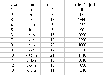 Az elérhető különféle induktivitásértékek - erről szólt a kérdés. (a variációk száma több lenne, de pl. minden tekercs fordítva bekötve is ugyanakkora induktivitású) Ha közös vasmagon két különböző tekercset párhuzamosan kapcsolsz, akkor az olyan mintha a lenne jópár rövidre zárt menet a vasmagon - ideális esetben ilyenkor (és ezt feltételeztük az egyszerüség kedvéért) a összes tekercs induktivitása nulla lesz (a gyakorlatban valóban marad egy kicsi parazita és szórási induktivitás). Tehát minden olyan kombináció amiben párhuzamos kapcsolás lenne, 0 induktivitást adna. Ezért próbáltalak rávezetni, hogy próbálj kiszámolni egy értéket - ha nekiállsz akkor rájöhettél volna, hogy valami nem stimmel...