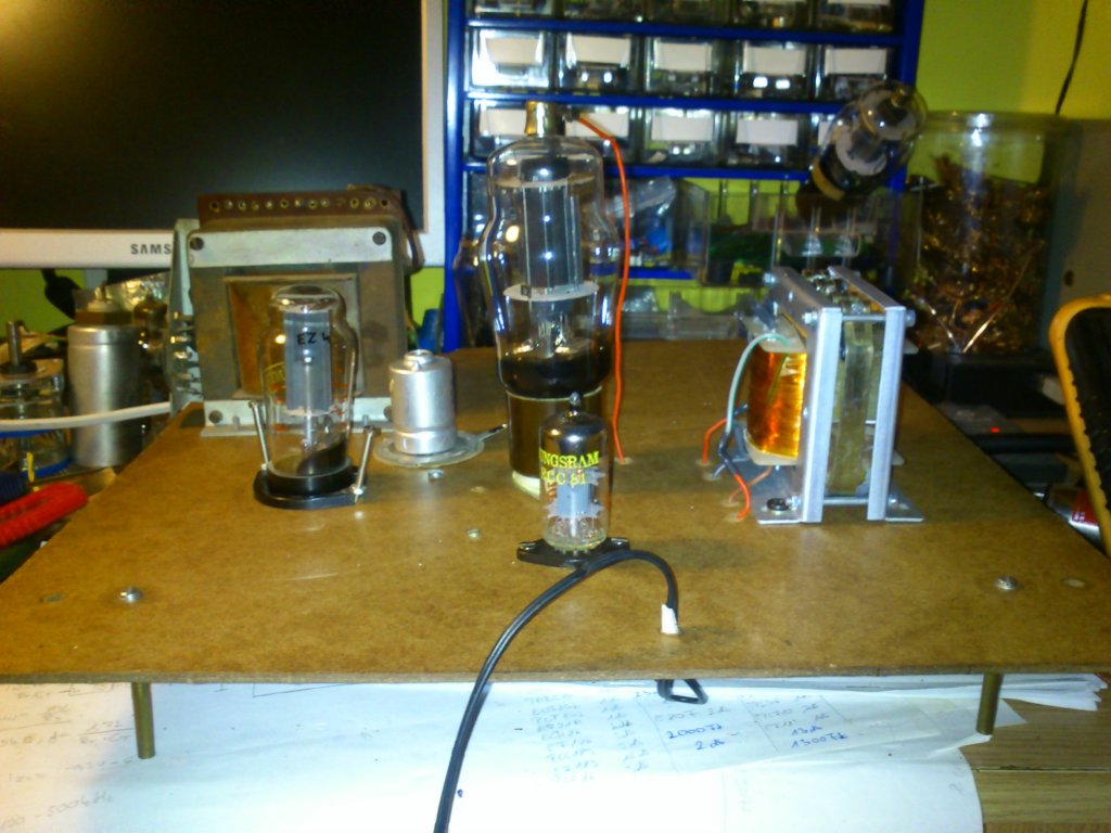 Eddig csak álmodoztam róla, de ma végre sikerült összeraknom egy SE 807-es erősítőt. Itt az oldalon találtam rajzot hozzá. Számomra nagyon megtetszett eme elektroncső formája, alakja, kerek idoma. Pár hónapja raktam is fel a 807--eseimről képet. Az építést gombóccal a torkomban és zabszemmel a fe...-kemben kezdtem el. Sok jót olvastam erről a csőről és reméltem, hogy nem csalódok benne. És nem is!! Az építés lassan ment, az egész napom ráment, összetúrtam hozzá az alkatrészeket és megfelelő egyencsövet kerestem hozzá. A hozzá elképzelt AZ1-es árama kevésnek bizonyult így EZ4-essel váltottam ki (itt megjegyezném, hogy akinek van AZ4 vagy EZ4-ese azzal cserélnék vagy vennék tőle). Előfokban ECC81-es munkálkodik. Bekapcsoláskor az állam leesett. Elképesztő milyen szép telt és karakterisztikus hangzása van. Két órányi zenehallgatás után is nehezemre esett kikapcsolni a drágát. Még egy napos sincs, de a feleségem már féltékeny rá, joggal Már alig várom, hogy nekikezdhessek a PP-s változatnak. Pár kép...a kupiért elnézést..