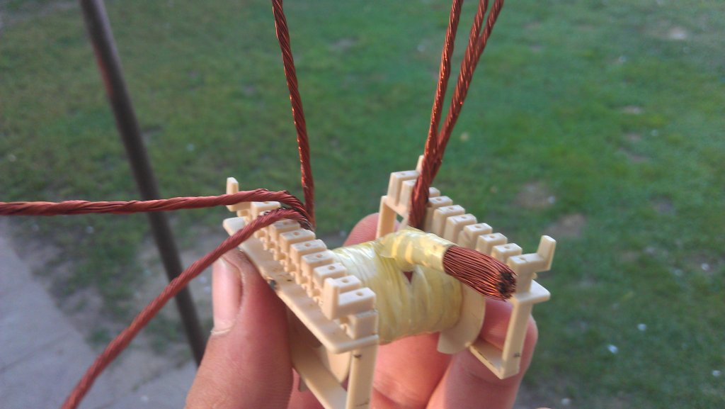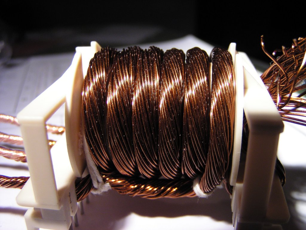 A képeken fölkerült a 2X36 menet 0.4-es huzal, aztán fölkerült egy próba szekunder. Ez amint látod vastag huzalból volt. Ez le lett cserélve 0,4-es huzalra. a Szekunder végül 2X10 menet lett. Aztán föltekertem még 2X36 szálat kívülre egy újabb primer tekercsnek.