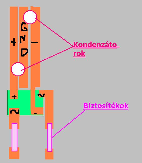 A táp puffer kondenzátorainak a GND-re menő lábai a lehető legközelebb legyenek egymáshoz. A GND vezető sáv egyik végére kösd a trafó középleágazást, és a túlsó végéről vidd a testet az erősítő felé. Ekkor lesz a legkevesebb a búgás. A hangszóró test ugyan köthető a csokiba is, de kétcsatornás erősítőnél előnyösebb a táp GND-re kötni, ezzel földhurok kialakulását előzheted meg.