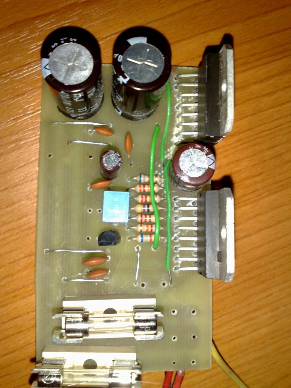 A párhuzamos kialakítás miatt a kimenet a bemenet előtt halad el, és jelen készültségi foknál minden bizonnyal gerjed. Áramhatároló nélkül ne élessz, mert nem fogod győzni IC-vel! Legalább soros izzót tegyél a táp elé.