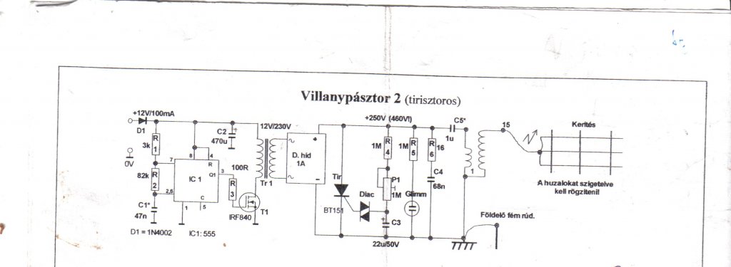 Bővebben: Link Én egy kicsit átalakítottam ezt.. 56ohm-os ellenállást kihagytam, FET-el sorba kötött dióda se kell oda, a védő dióda mellé párhuzamosan tettem egy védő kondit is, és nekem egy BC182 tranzisztor van még a FET elé téve. Úgy emlékszem az időzítéssel is szórakoztam, mire jó lett... fél másodpercenkét szikrázik nekem. Ha jól tudom, az a vezérlés lényege, hogy a kapcsoló FET-et kb fél másodpercre zárni kell, hogy kialakuljon a gyújtótrafó tekercsében a mágneses tér, aztán egy pillanatra (minél rövidebb időre) nyitni kell a FET-et, és ez a változás fogja a szekunder tekercsen indukálni a minivillámot. E-szerint kell beállítani az 555-áramkörös részt. itt lehet is számolgatni vele: Bővebben: itten ni!